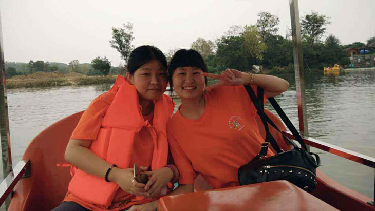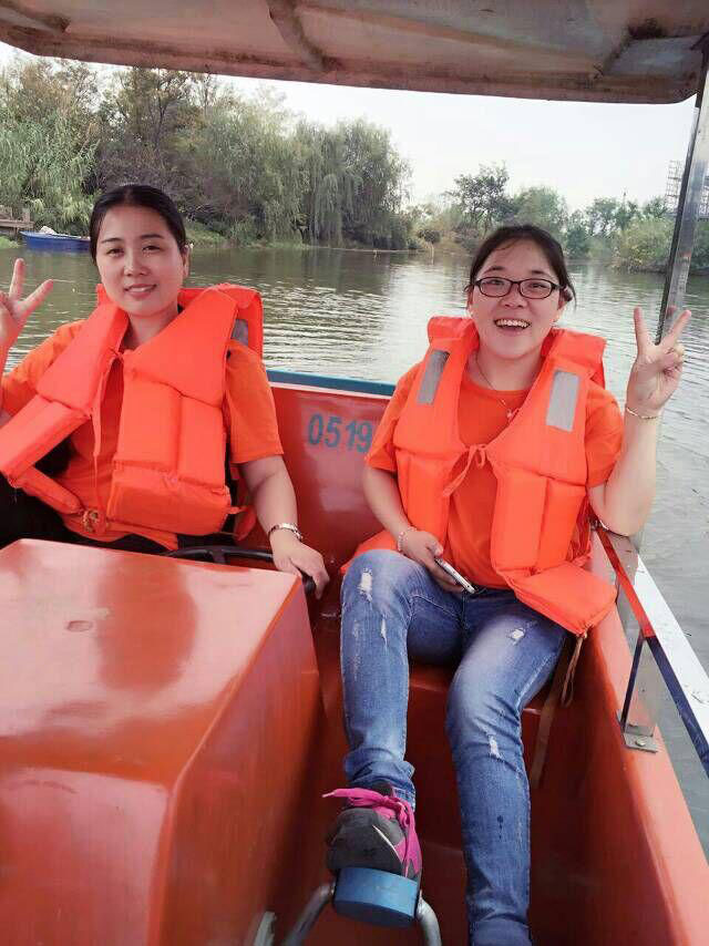 划船的时候四个帅哥的那条船被骄傲地称为“灰太狼”船,老是追逐着只有四个瘦小美女的“喜洋洋”船,别以为女生比不过男生,知道吗?我们君通娘子军个个不输儿男,为了躲避追赶和水泼,美女队不停地划桨绕着小桃花岛两圈,终甩掉了“灰太狼”。。。。。上岸后我好想大声喊下我们君通的口号: