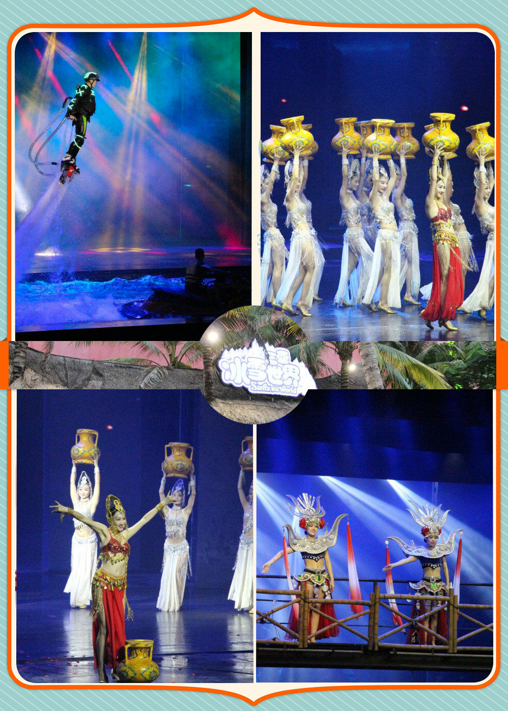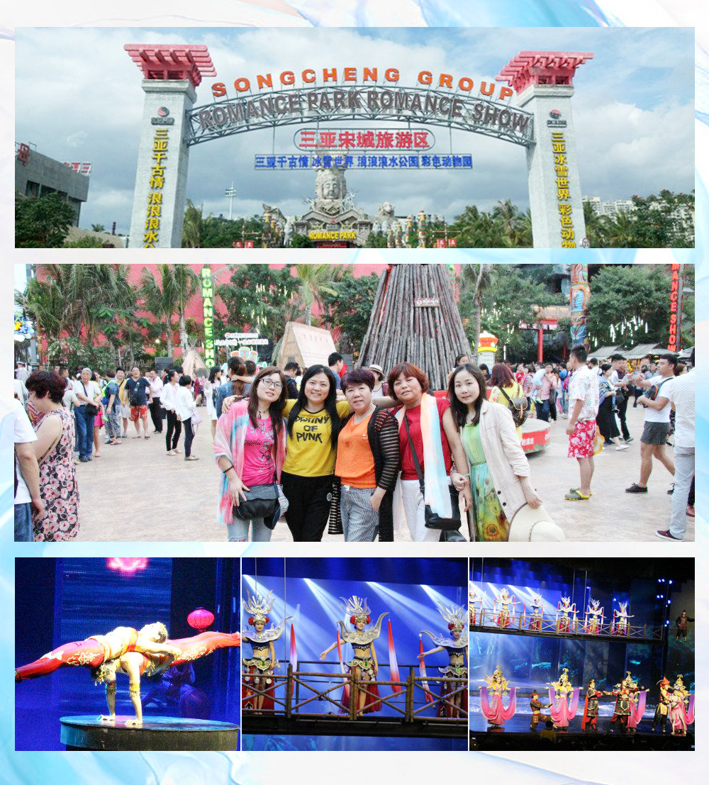 在王导的带领下我们又来到三亚宋城千古情景区,整个景区都是按照三亚原始逼真的历史文化及黎族人的生活气息来建造的,先在小吃广场疯狂的吃起来吧,随后彩色动物园,冰雪世界,水上乐园,崖州古城,清明上河图,宋城六间房广场等几十个主题园区让人应接不暇,尤其在水上乐园,游泳,冲浪,玩设施,浦兵,邓总,乔总,阿杜,谈经理都各自带着孩子下水嬉戏啦,不过我怎么感觉他们玩的比孩子还投入,堪称君通的“大小孩”!下午五点的时候重头戏来了,给我,还你千年!这是三亚千古情!大型歌舞秀【三亚千古情】震撼人心,绚烂多彩的舞台效果,华丽夺目的主题服饰,空降的天兵神将,凌空水幕里的美人鱼巡游其中,性感飘逸!千古情演绎的历史穿越万年,让我们在这里感受到鲜为人知的落笔洞文明历史、巾帼英雄冼夫人的传奇人生、不畏艰险的鉴真东渡、海上丝路,不虚此行!