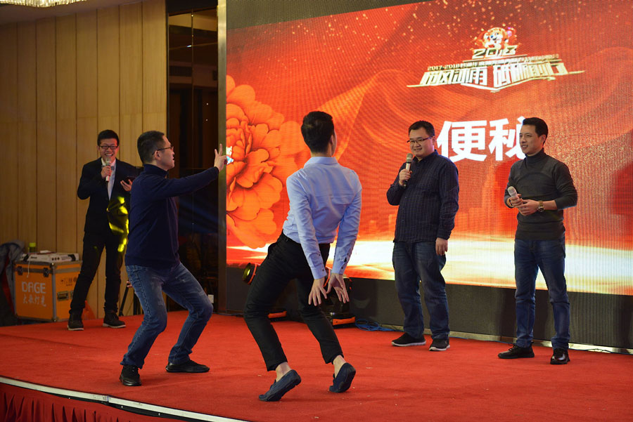 尤其值得一提的是平均年龄较长的市场部,他们带来的舞蹈《C哩C哩》动作整齐有力,充满激情,向大家展示了矫健的身手,乔总邓总的花式加入更是锦上添花。同时他们和技术部的跨部门合作小品《我们都是木头人》爆笑登场,将晚会气氛再次推向高潮,赢得大家的阵阵掌声和欢呼,为晚会填上了绝妙难忘的一笔。一张桌来四张口,却好似有着魔力,不断挠着观众笑点,台下笑声不断。