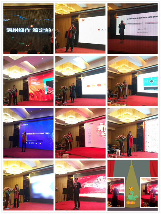 接下来依次是技术部的杜总,客服部的刘苏,设计顾工、行政顾雪萍、人事何淑琴、市场大区经理赵经理、张经理、宋经理、电销高经理齐经理等纷纷上台各职责部门2017年度的工作做总结报告与2018年工作的展望。我们的大家长尹总也做了精彩的发言,希望大家一起齐心协力,携手奋进,撸起袖子加油干!