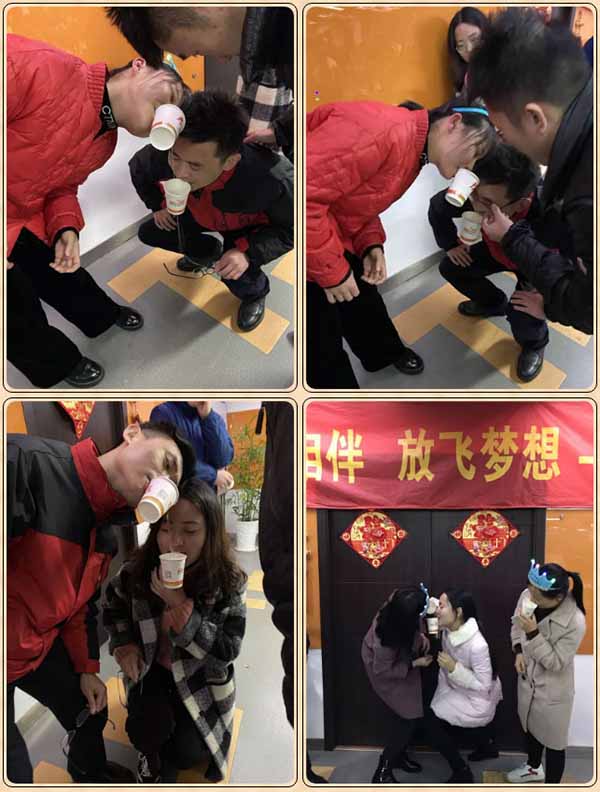 要求:人员选6名一组,男女交替配合。共选十二名员工,分二组同时进行比赛。另有二名人员辅助组人员倒水至衔至的纸杯内,再一个个传递至下一个人的纸杯内,一人的纸杯内的水倒入一个小缸内,在限定时间内,看谁的缸内的水多,谁就获胜。